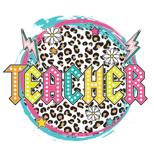 Regular price From £0.75 GBPRegular priceUnit price / per£2.40 GBPSale price From £0.75 GBPA vibrant graphic design featuring the word "TEACHER" in bold, colorful letters with playful elements like flowers and stars.DTF Transfers