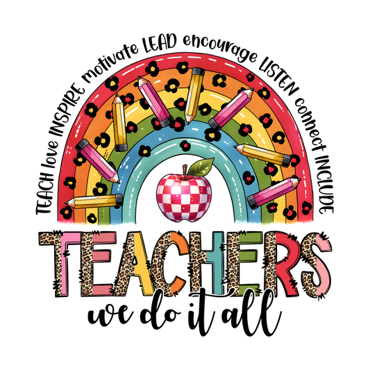 A vibrant rainbow design featuring pencils and an apple, celebrating teachers with the phrase "Teachers we do it all."DTF Transfers