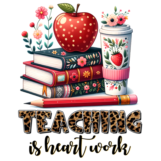 A vibrant illustration featuring stacked books, a red polka-dotted apple, a decorative cup, a pencil, and the phrase "Teaching is heartwork."DTF Transfers