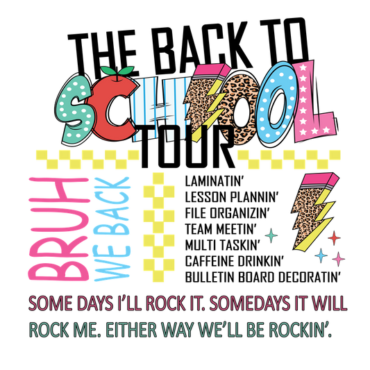 Regular price From £0.75 GBPRegular priceUnit price / per£2.40 GBPSale price From £0.75 GBPA vibrant graphic design celebrating back-to-school vibes with playful text and colorful patterns, perfect for a spirited school year!DTF Transfers