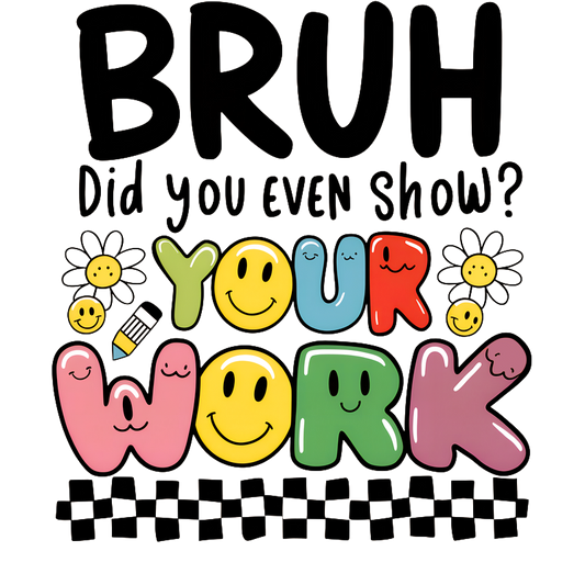 Fun and lively design featuring the phrase "BRUH Did you even show YOUR WORK?" with cheerful emojis and flowers.DTF Transfers