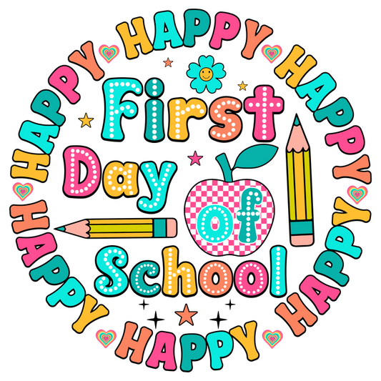 A colorful illustration celebrating the "First Day of School," featuring playful text, an apple, and pencils.DTF Transfers