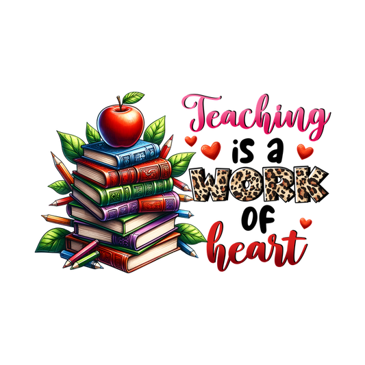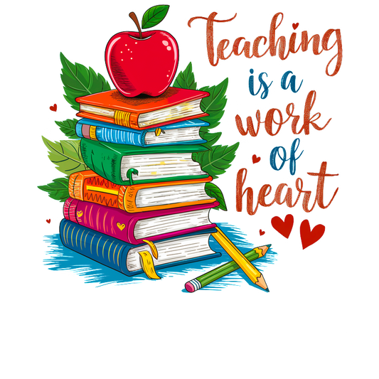A vibrant illustration featuring stacked books, an apple, and the phrase "Teaching is a work of heart" to celebrate educators.DTF Transfers