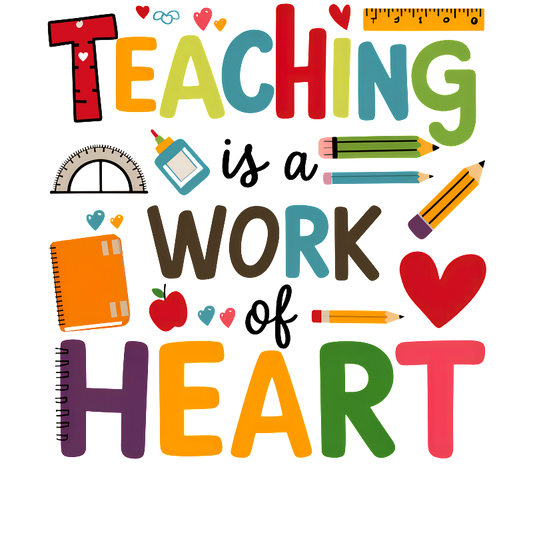 This vibrant design celebrates teaching, featuring colorful letters and school supplies, emphasizing that "Teaching is a work of heart."DTF Transfers