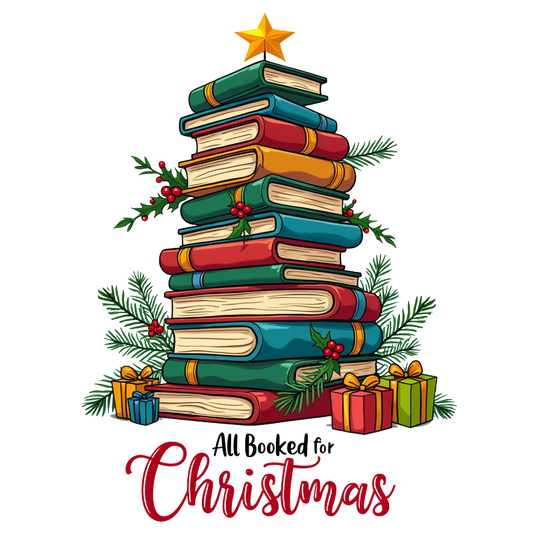 Regular price From £0.75 GBPRegular priceUnit price / per£2.40 GBPSale price From £0.75 GBPA whimsical design featuring a stack of colorful books styled as a Christmas tree, adorned with gifts and greenery.DTF Transfers