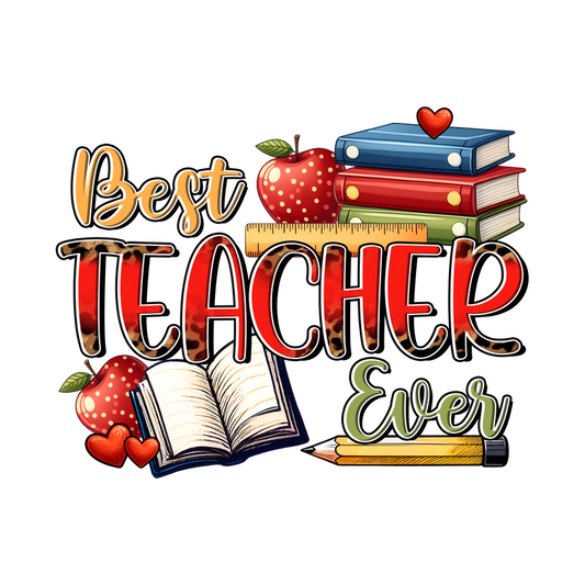Celebrate your favorite educator with this vibrant "Best Teacher Ever" design featuring apples, books, pencils, and a fun leopard print!DTF Transfers