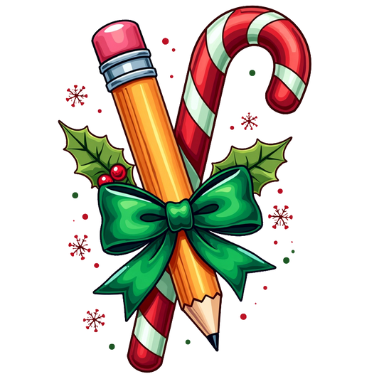 A festive illustration featuring a pencil and a candy cane, beautifully adorned with holly leaves and a green bow.DTF Transfers