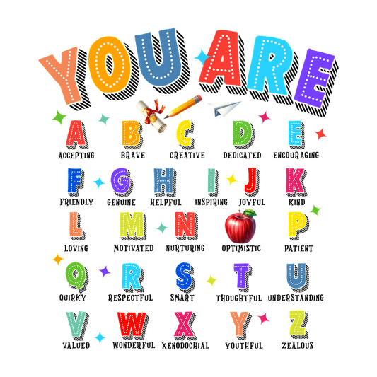 Regular price From £0.75 GBPRegular priceUnit price / per£2.40 GBPSale price From £0.75 GBPColorful alphabet letters, featuring "YOU ARE" prominently, along with playful icons like an apple and tools, perfect for educational settings.DTF Transfers