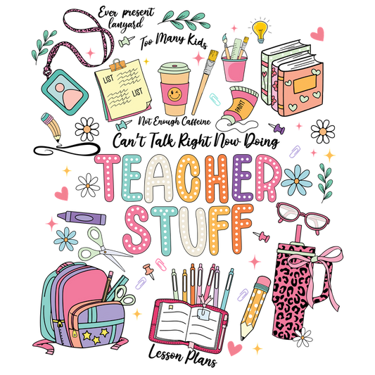 A colorful, playful illustration featuring various teaching supplies and the words "Teacher Stuff" in bold, cheerful letters.DTF Transfers