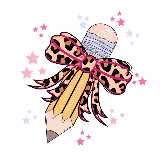 A cute pencil adorned with a leopard print bow and surrounded by colorful stars, perfect for adding flair to your stationery!DTF Transfers