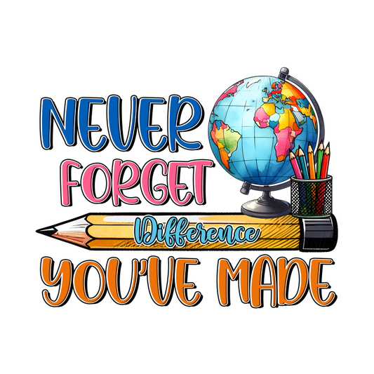 A vibrant illustration featuring a globe, pencils, and the inspiring message "Never forget the difference you’ve made."DTF Transfers