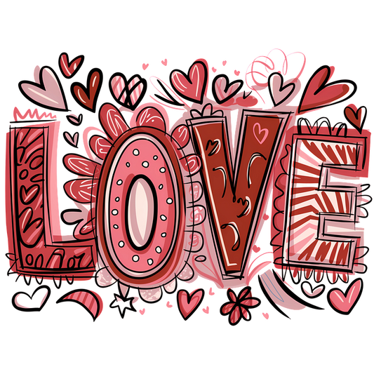 A vibrant and playful illustration featuring the word "LOVE" surrounded by colorful hearts and decorative elements.DTF Transfers