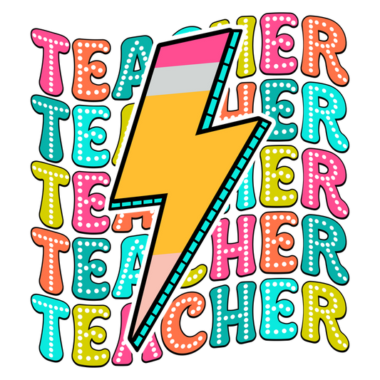 Bright and colorful "Teacher" graphic featuring a bold lightning bolt design, perfect for celebrating educators' impact and energy!DTF Transfers