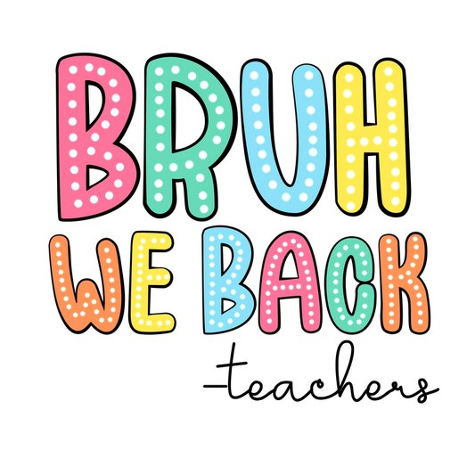 Regular price From £0.75 GBPRegular priceUnit price / per£2.40 GBPSale price From £0.75 GBPColorful and playful text design that reads "BRUH WE BACK," featuring sparkling letters on a black background.DTF Transfers