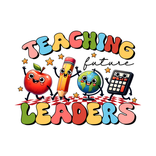 A colorful and cheerful illustration featuring cute animated characters like an apple, pencil, globe, and calculator with the text "Teaching Leaders."DTF Transfers