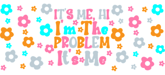 A vibrant and playful design featuring colorful flowers and the text "It's me! I'm the problem, it's me."UV Transfers heat press transfers