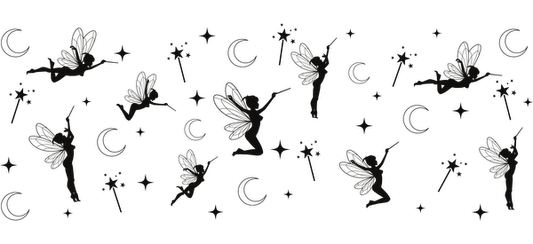 A whimsical pattern featuring silhouetted fairies, crescent moons, and stars, perfect for adding a touch of magic to any design.UV Transfers dtf prints