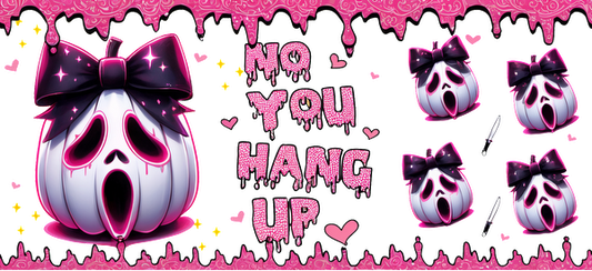A whimsical, pink and black graphic featuring a ghostly pumpkin with a bow and playful text, perfect for Halloween vibes.UV Transfers dtf prints