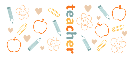 A colorful design featuring "teacher" surrounded by playful icons like apples, pencils, flowers, and hearts, perfect for educational settings.UV Transfers heat press transfers