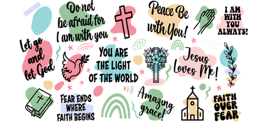 A vibrant collection of colorful faith-based stickers featuring uplifting messages, symbols, and illustrations, perfect for personalizing items.UV Transfers dtf prints