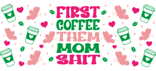A vibrant and playful graphic featuring the phrase "First Coffee Then Mom Shit," surrounded by coffee cups, hearts, and butterflies.UV Transfers dtf transfers