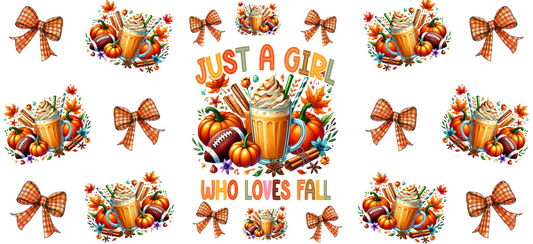 A vibrant fall-themed design featuring pumpkins, autumn leaves, and a festive drink, accompanied by the phrase "Just a girl who loves fall."UV Transfersdtf regular iron