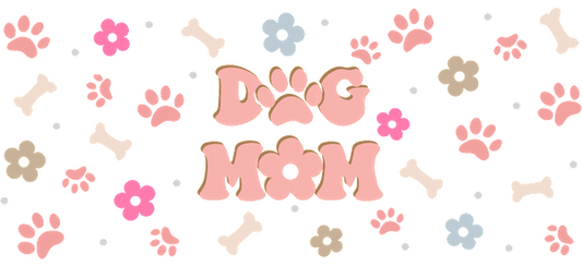 Celebrate your love for dogs with this playful "Dog Mom" design, featuring paws, bones, and flowers in soft pastel colors.UV Transfers dtf transfers