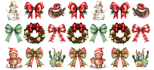 A festive collection of Christmas-themed decorations, featuring snowmen, wreaths, bows, and cheerful characters, perfect for holiday cheer.UV Transfersdtf regular iron