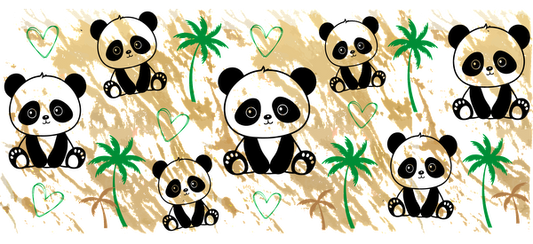 A whimsical illustration featuring adorable pandas surrounded by palm trees and playful hearts, perfect for nature lovers!UV Transfers dtf prints