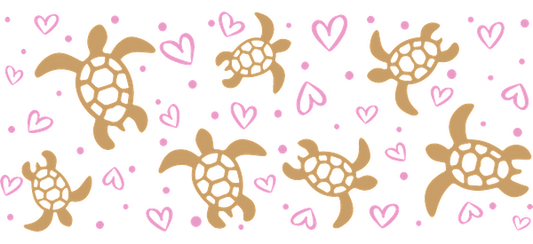 A whimsical pattern featuring gold sea turtles and pink hearts, perfect for adding a playful touch to any design.UV Transfers dtf transfers