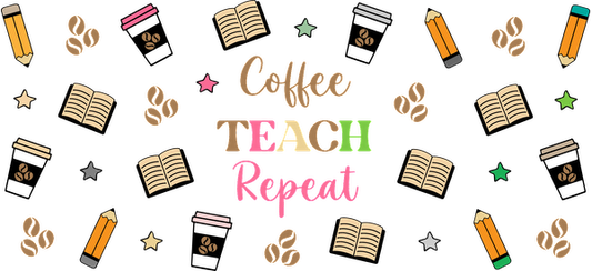 A vibrant design featuring coffee beans, books, and pencils with the playful phrase "Coffee, TEACH, Repeat" in cheerful colors.UV Transfers heat press transfers