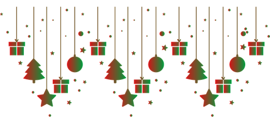 A festive design featuring hanging Christmas trees, ornaments, stars, and gifts, all in vibrant red and green colors.UV Transfers dtf transfers