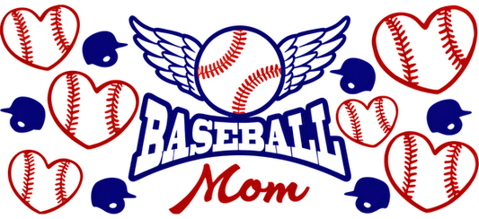 Celebrate your love for baseball with this colorful "Baseball Mom" design featuring hearts, baseballs, and wings!UV Transfers dtf prints