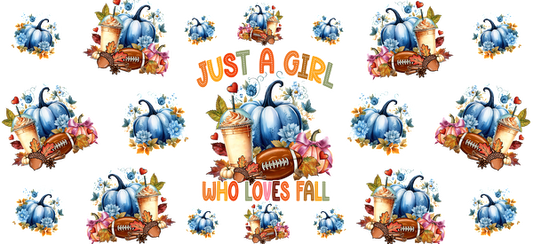 A charming fall-themed design featuring blue pumpkins, footballs, and autumn decorations with the text, "Just a Girl Who Loves Fall."UV Transfers heat press transfers