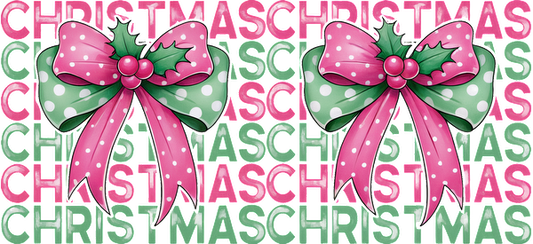 A festive graphic featuring colorful bows with polka dots and holly, set against a repeating "Christmas" text backdrop.UV Transfers dtf prints