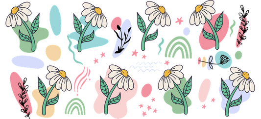 A vibrant and playful pattern featuring daisies, colorful shapes, and whimsical elements, perfect for adding a cheerful touch.UV Transfers dtf prints