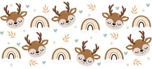 A whimsical pattern featuring cute deer faces, rainbows, and autumn leaves, perfect for playful and cozy designs.UV Transfers dtf prints