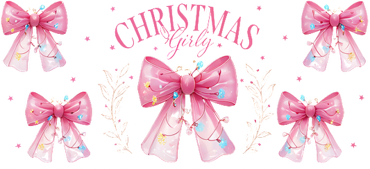 A festive design featuring charming pink bows adorned with colorful accents, perfect for Christmas decorations and celebrations.UV Transfers dtf transfers