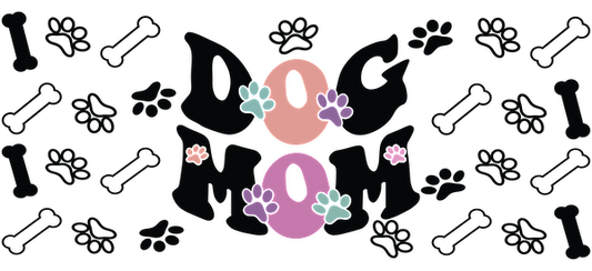 A playful design celebrating dog moms, featuring the phrase "DOG MOM" with colorful paw prints and floral accents.UV Transfers dtf transfers
