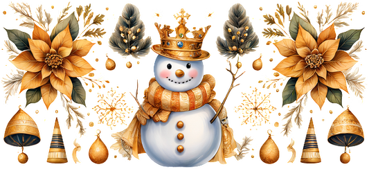 A cheerful snowman adorned with a golden crown and scarf, surrounded by elegant winter florals and festive decorations.UV Transfers heat press transfers