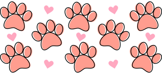 Pink paw prints on a black background.UV Transfers