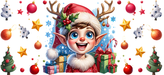 A cheerful, cartoonish young elf with antlers and a festive outfit surrounded by Christmas decorations and gifts.UV Transfers dtf transfers