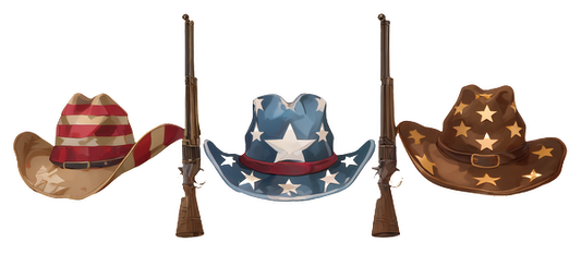 A vibrant collection of three cowboy hats in patriotic designs, paired with rifles, showcasing Western-themed style and flair.UV Transfersdtf regular iron
