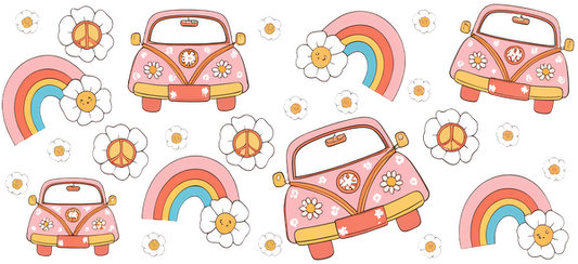 A whimsical pattern featuring cute pink vintage cars, colorful rainbows, cheerful flowers, and peace symbols, perfect for a retro vibe.UV Transfers dtf transfers