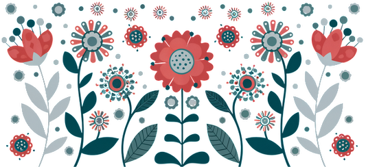 A vibrant floral pattern featuring various flowers in shades of red, teal, and white, surrounded by leafy designs.UV Transfers heat press transfers