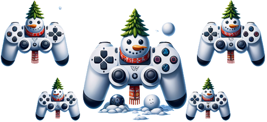 Playful holiday-themed gaming controllers featuring whimsical snowmen adorned with tiny Christmas trees and surrounded by snowballs.UV Transfers dtf transfers