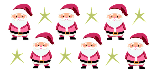 A cheerful group of cartoon Santa Clauses in pink suits, surrounded by bright yellow stars, perfect for festive decorations!UV Transfers dtf prints