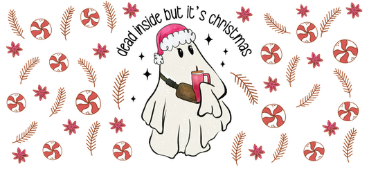 A cute, festive ghost wearing a Santa hat holds a drink surrounded by colorful peppermint candies and cheerful winter decorations.UV Transfers heat press transfers