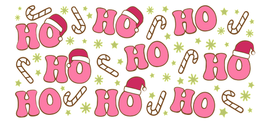 A festive illustration featuring playful pink "HO" text adorned with Santa hats, candy canes, and cheerful snowflakes.UV Transfersdtf regular iron
