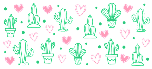 Black and white cacti in black pots arranged on a green background.UV Transfers